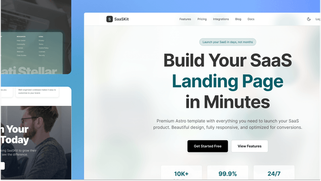 SaaSKit is a production-ready SaaS landing page template built with Astro 5, React, and Tailwind CSS. Features include a complete documentation system with search, blog system, 5 hero section variations, dark mode, and 10+ pre-built UI components. Perfect for SaaS startups, product launches, and businesses needing a professional web presence fast.