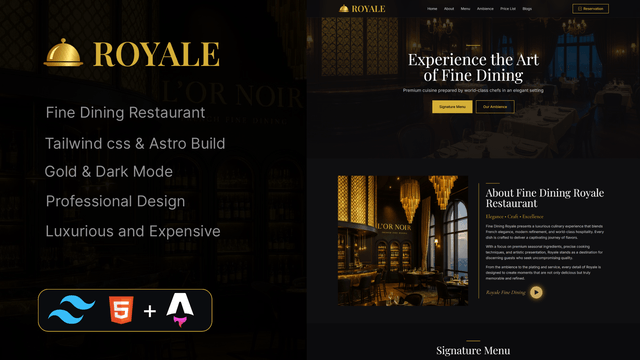 Royale is a Restaurant Astro Website Template, luxury-first website template crafted exclusively for fine dining restaurants