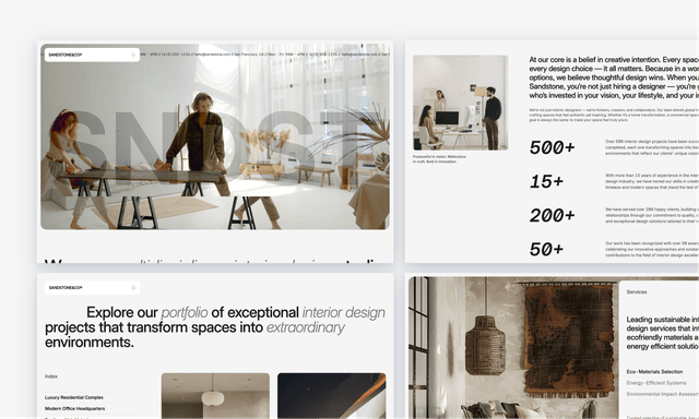 An Astro + Tailwind CSS interior design studio theme with a minimal layout, clean structure, and typography-driven presentation.