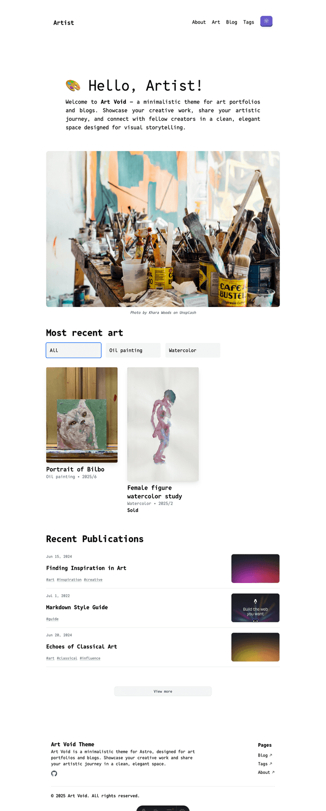 Art Void — a minimalistic theme for art portfolios and blogs. Showcase your creative work, share your artistic journey, and connect with fellow creators in a clean, elegant space designed for visual storytelling.