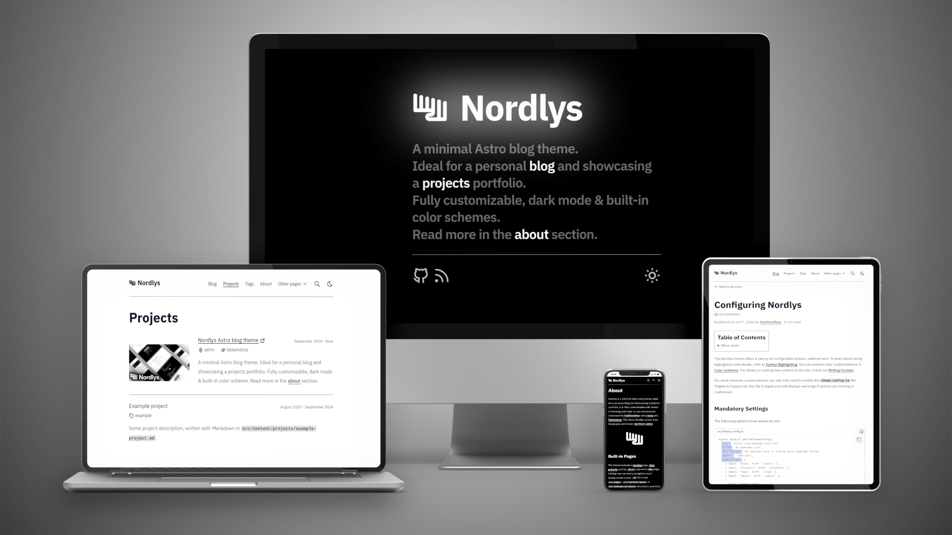 Nordlys is a minimal blog theme, ideal for a personal blog and showcasing a projects portfolio. It is fully customizable and easily configurable, includes built-in color themes, code blocks with custom headers and a dark & light mode. Simple, but elegant, it looks good both on mobile and desktop and it is quick to take into use and so you can immediately start writing content.